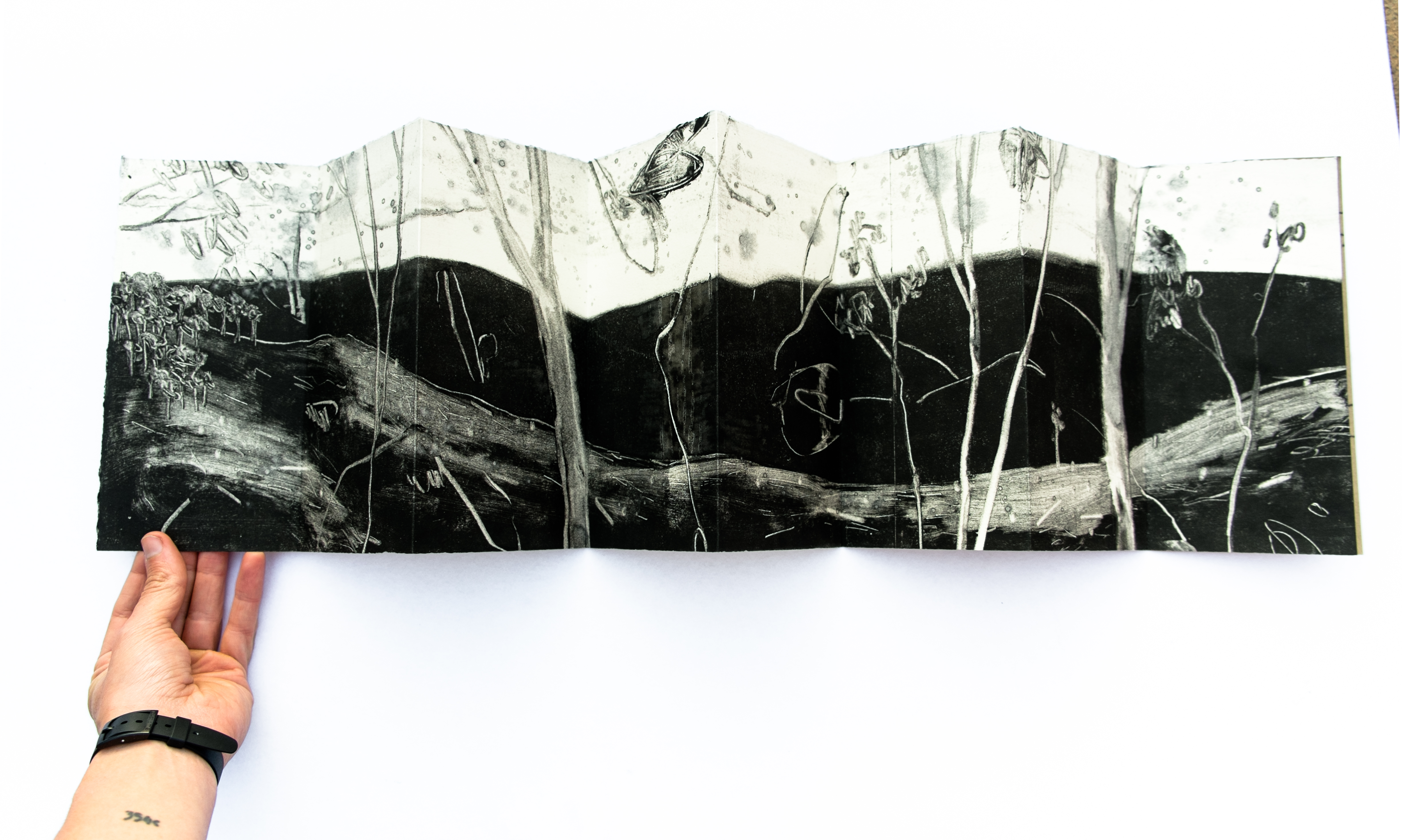 11 monoprints on 250gsm Hahnemule paper, concertina structure artist book, 53x33cm (closed)